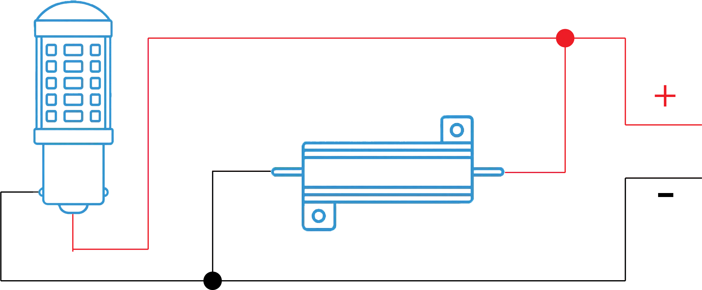 - Install resistor (parallel): One resistor per side across turn + and ground. Mount to metal; avoid plastic.
